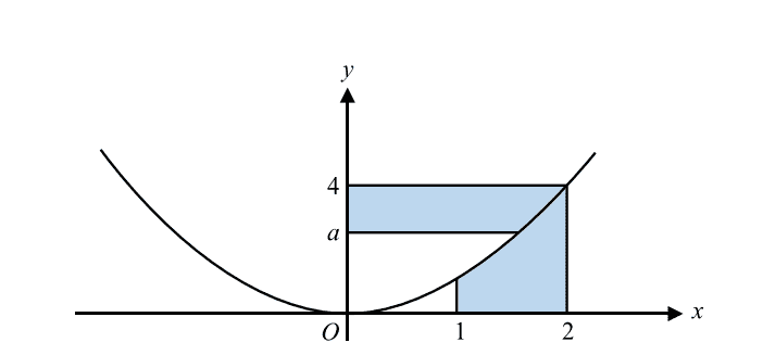The diagram shows the curve with equation $y={{x}^{2}}$. The area of the region bounded by the curve, the lines $x=1$, $x=2$ and the $x$-axis is equal to the area of the region bounded by the curve, the lines $y=a$, $y=4$ and the $y$-axis, where $a<4$. Find the value of $a$.[4]