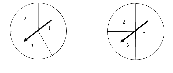 A circular card is divided into 3 sectors scoring 1, 2, 3 and having angles $135{}^\circ $, $90{}^\circ $, $135{}^\circ $ respectively. On a second circular card, sectors scoring 1, 2, 3, have angles $180{}^\circ $, $90{}^\circ $, $90{}^\circ $ respectively (see diagram). Each card has a pointer pivoted at its centre. After being set in motion, the pointers come to rest independently at random positions. Find the probability that